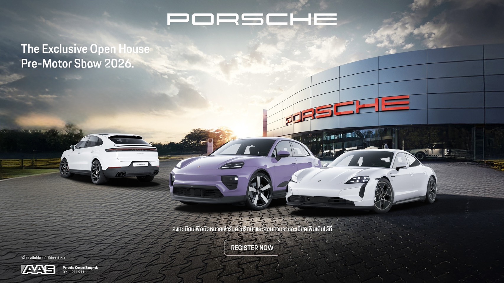 กรุงเทพฯ – เอเอเอส ออโต้ เซอร์วิส ผู้แทนจำหน่ายรถยนต์ปอร์เช่อย่างเป็นทางการแห่งแรกในประเทศไทย ขอเชิญลูกค้าคนสำคัญและผู้ที่หลงใหลในยนตรกรรมสปอร์ตระดับโลก ร่วมสัมผัสประสบการณ์สุดเอ็กซ์คลูซีฟที่ Porsche Centre Bangkok ในแคมเปญ “The Exclusive Open House Pre Motor Show” ระหว่างวันที่ 16-22 มีนาคม 2569 เปิดโอกาสให้ลูกค้าได้เยี่ยมชมยนตรกรรมปอร์เช่หลากหลายรุ่นอย่างใกล้ชิดภายในโชว์รูม ก่อนเริ่มงาน Bangkok International Motor Show อย่างเป็นทางการ